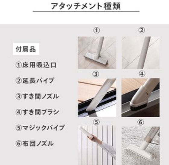 ●付属品:充電台、ACアダプター、床用吸込口、延長パイプ、すき間ノズル、すき間ブラシ、マジックパイプ、布団ノズル