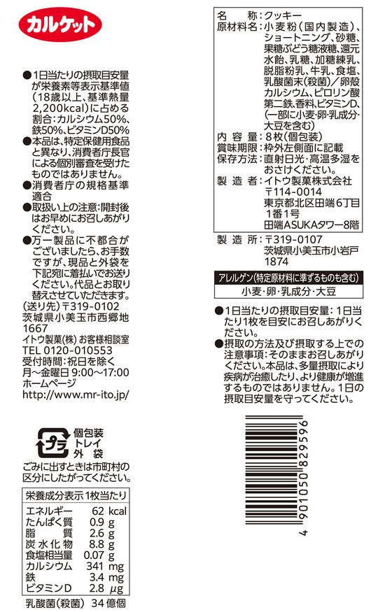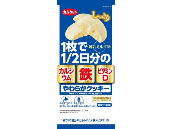 北海道牛乳と国産小麦を使用し、個包装1枚でカルシウム341mg、鉄3.4mg、ビタミンD2.8μgが摂れます。さらに、乳酸菌(殺菌)34億個を配合しています。栄養素等表示基準値(18歳以上、2、200kcal)を目安2.しっとりやわらかい食感、3.安心も、美味しさも北海道牛乳と国産小麦を100%使用した、こだわりの配合です。