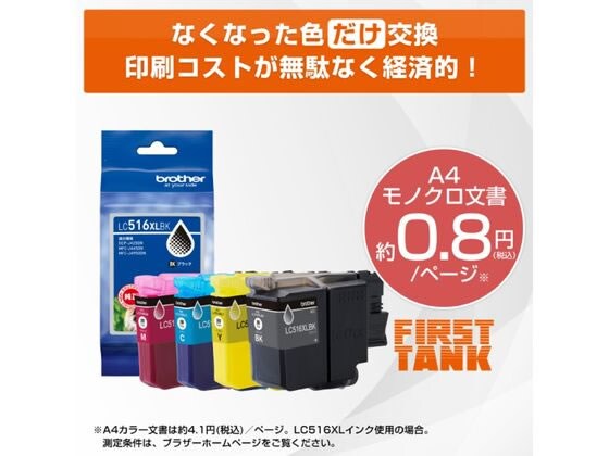 ●印字コスト(A4文書):カラー:約4.1円(税込)/ページ、モノクロ:約0.8円(税込)/ページ(詳しい測定条件につきましてはブラザーホームページをご確認ください)