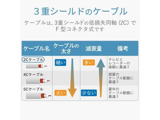 ●入力側はL形プラグに2C極細3重シールドの低損失同軸ケーブル付(1.5m)です。出力側はF形コネクタ式。入力側は壁面TV端子に差し込むだけ。出力側のテレビやレコーダーへの接続には別売の同軸ケーブルを使用します。