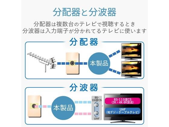 ●新4K8K衛星放送に対応した入力・出力側ケーブル付分波器。テレビの電波を地デジ(UHF)とCS/BSに分けます。