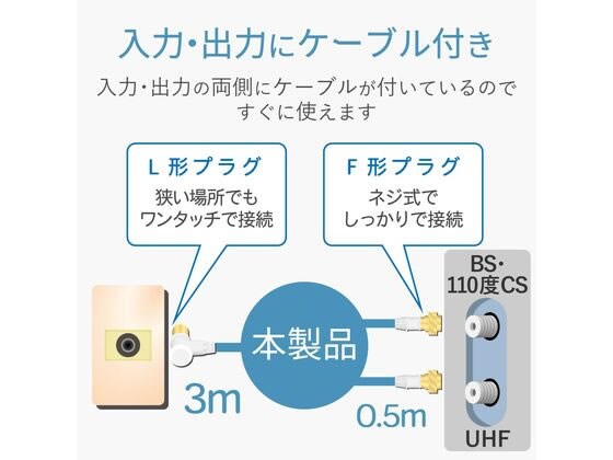 ●2C極細3重シールド低損失同軸ケーブル採用。入力側はケーブル(3m)に先端L形プラグ式、出力側はケーブル(0.5m)に先端F形プラグ式。入力側ケーブルが3mなので、壁面TV端子とテレビやレコーダーが離れている場合に最適。
