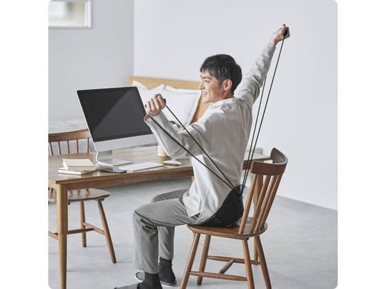 ●付属のチューブを使って大きく腕を動かすことで肩周りをほぐし、隙間時間に手軽にストレッチ可能