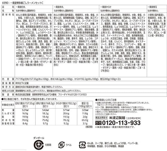 ●内容量:白丸ラーメン157.55g(麺・スープ・基だし・紅しょうが・ペッパー各1袋)・赤丸ラーメン168.2g(麺・スープ・基だし・辛味噌・香油各1袋)・からか麺192.2g(麺・スープ・基だし・レトルト具材・ラー油各1袋)・替玉(100g×2袋)各1個