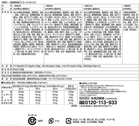 ●内容量:白丸ラーメン157.55g(麺・スープ・基だし・紅しょうが・ペッパー各1袋)・赤丸ラーメン168.2g(麺・スープ・基だし・辛味噌・香油各1袋)・からか麺192.2g(麺・スープ・基だし・レトルト具材・ラー油各1袋)・替玉(100g×2袋)各2個