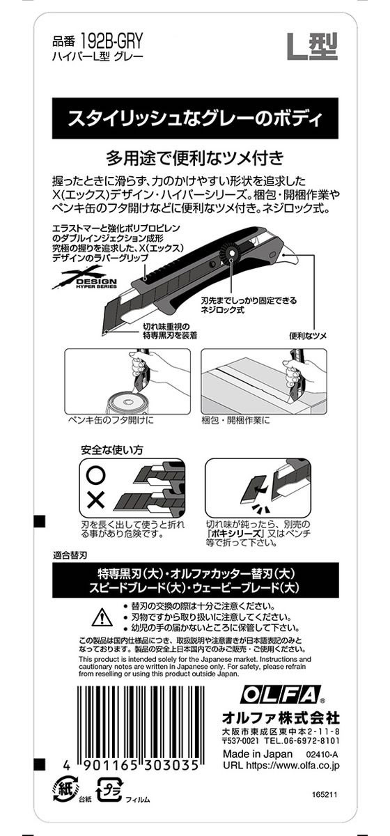 オルファ ハイパーL型 グレー 192B-GRY 本体 大型 カッターナイフ 切る 文具 事務