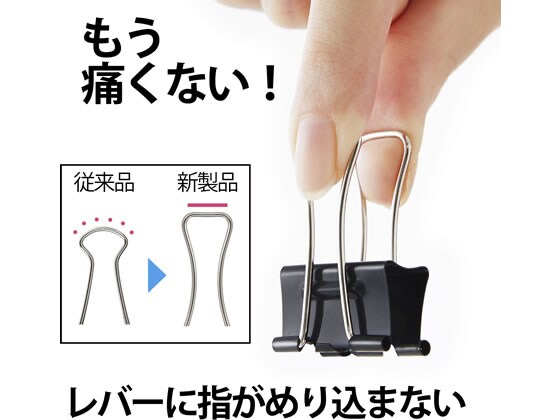 本体部分に突起をつくり支点の位置をずらし、さらにレバーの長さを伸ばすことで、従来品より軽い力で簡単にクリップを開くことができます。レバー先端の形状をフラットに変更。接地面積が増え滑りにくくフィット感がアップしました。