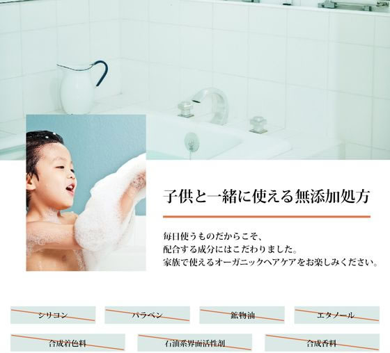 シリコン、SLS、石油系界面活性剤、パラベン、鉱物油、合成香料、合成着色料、動物由来原料は不使用。植物由来原料のみ使用しています。