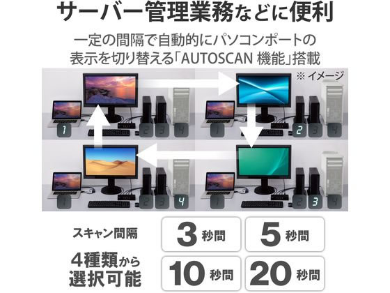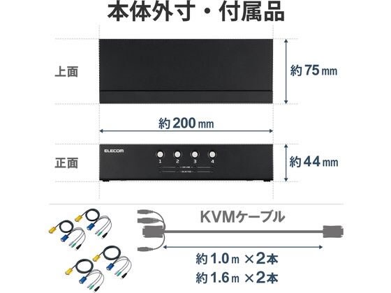 1組のマウス、キーボード、VGAディスプレイで、4台のパソコンを切り替えて操作できるパソコン切替器(KVM)です。パソコンが4台あっても、1組のマウス、キーボード、VGAディスプレイで操作できるため、低コスト、省スペースを実現し、ケーブルの挿し直しの手間も省けます。PS/2やVGA端子など、レガシーインターフェイスを使用している環境でも使用可能です。