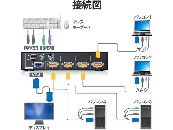 1組のマウス、キーボード、VGAディスプレイで、4台のパソコンを切り替えて操作可能!