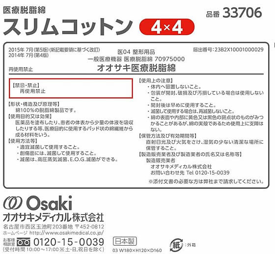オオサキメディカル スリムコットン 4×4 500G 33706