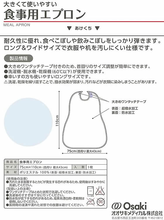 ●大きめのワンタッチテープを使用しているため、首まわりのサイズ調整が簡単にできます。(首まわり最大43cm)