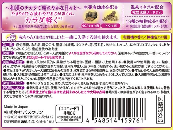 ●生薬有効成分(センキュウ末、トウキ末)と温泉ミネラル(乾燥硫酸ナトリウム)配合。温浴効果を高めて、血行促進、たまりがちな疲れやだるさを緩和。