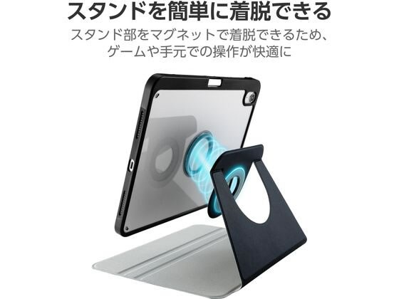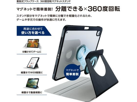 マグネットで簡単着脱!360度回転でき、縦向き、横向きのお好きな角度で使用できるiPad(A16)、iPad (第10世代 2022年モデル)用フラップケースです。 スタンド部をマグネットで簡単に分離できるため、軽量化され、ゲームや手元での操作が快適に行えます。 マグネット固定部で360度回転ができ、機器本体を縦置きでWeb閲覧に、横置きで動画視聴に最適です。
