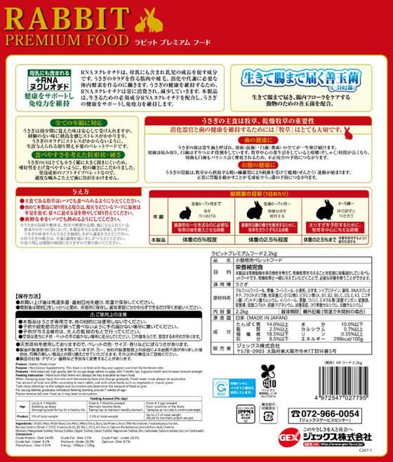 ●原材料:アルファルファミール、粟糠、コーンミール、小麦粉、ふすま、ソイプロテイン、酵母、RNAヌクレオチド、フラクトオリゴ糖、枯草菌(C-3102株)、ビタミン類(A、B1、B2、B6、C、D3、E、K3、ニコチン酸、パンテトン酸カルシウム、イノシトール、葉酸、コリン)、ミネラル類(硫酸マンガン、硫酸鉄、硫酸銅、硫酸コバルト、硫酸マグネシウム、炭酸亜鉛、ヨウ素酸カルシウム、炭酸カルシウム)