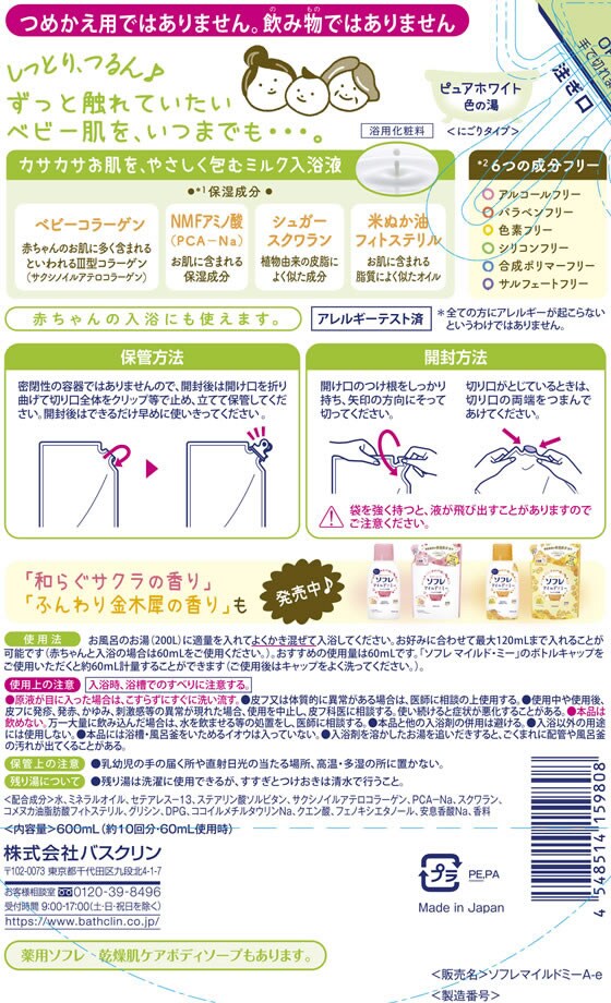●残り湯は洗濯に使用できるが、すすぎとつけおきは清水で行うこと。[表示成分/全成分]水、ミネラルオイル、セテアレス-13、ステアリン酸ソルビタン、サクシノイルアテロコラーゲン、PCA-Na、スクワラン、コメヌカ油脂肪酸フィトステリル、グリシン、DPG、ココイルメチルタウリンNa、クエン酸、フェノキシエタノール、安息香酸Na、香料