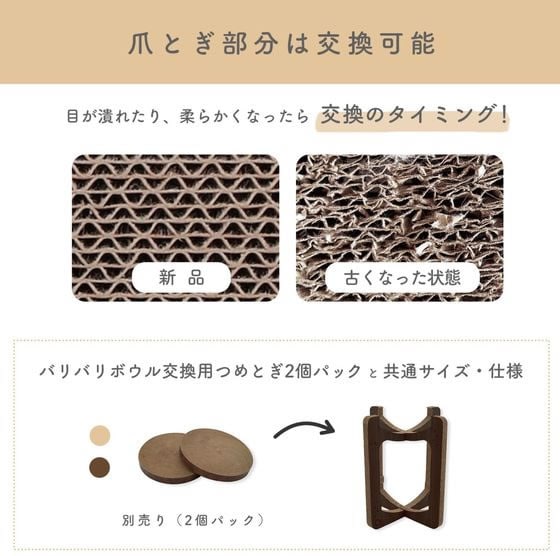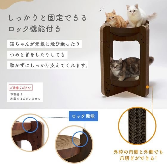高いところで眠るのが好きな猫ちゃんにはもちろん、キャットタワーに登るのはちょっと怖い高いところが苦手な猫ちゃんにも高すぎない高さです。おひとり様使いも、多頭飼いのおうちにもおすすめ。1階と2階のつめとぎベッドは、交換が可能です。「ロック機能」がついています。つめとぎベッドがずれるのを防いでくれます。原料となる紙のうち、10%はニュージーランド産の原パルプ紙を使用しています。