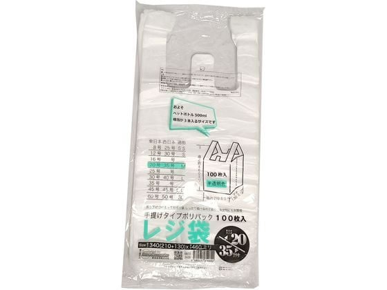 日常のまとめ買いにも便利な大きめ半透明レジ袋。東日本「20号」、西日本「35号」サイズで、500mlペットボトル3本も余裕で入ります。幅広持ち手で持ちやすく、厚手で破れにくい設計。中身が見やすい半透明タイプなので、ゴミ袋や分別袋としても大活躍。100枚入りで経済的。ご家庭にも店舗にも最適な万能手提げ袋です。
