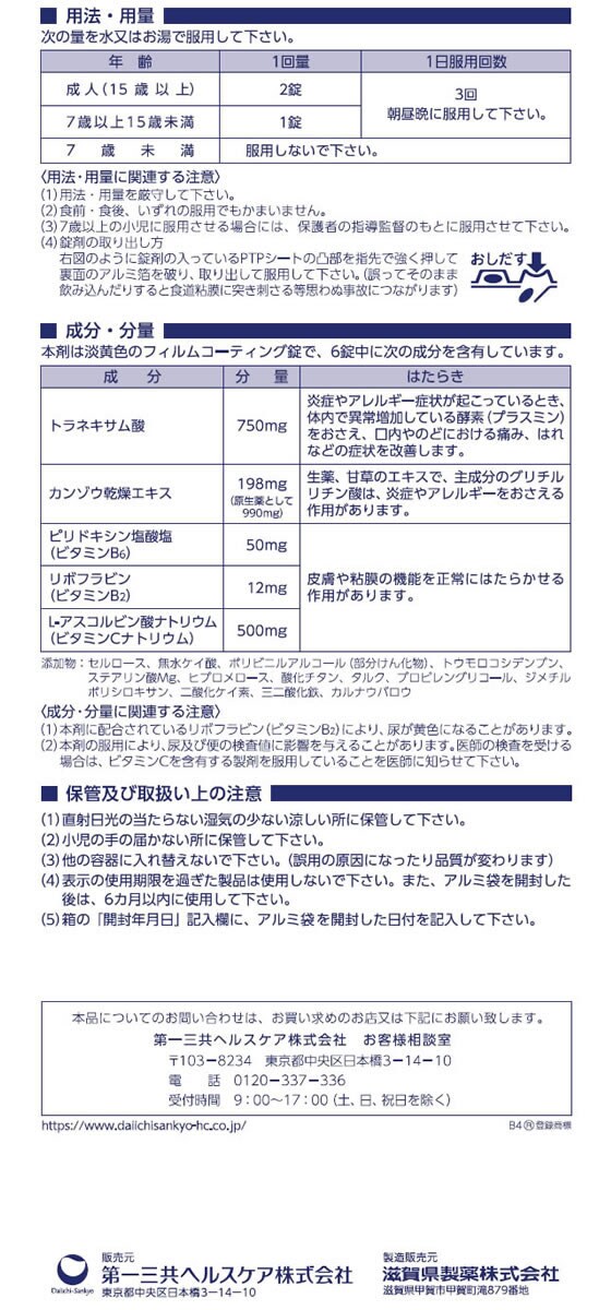 ●のどの炎症をおさえるトラネキサム酸に、カンゾウ乾燥エキスと3種類のビタミンを配合した、のどの痛み、はれをおさえる薬です。