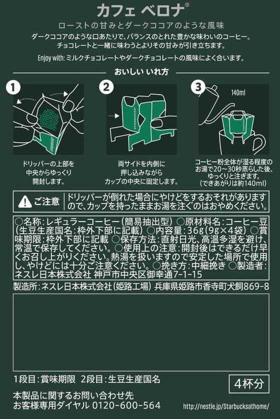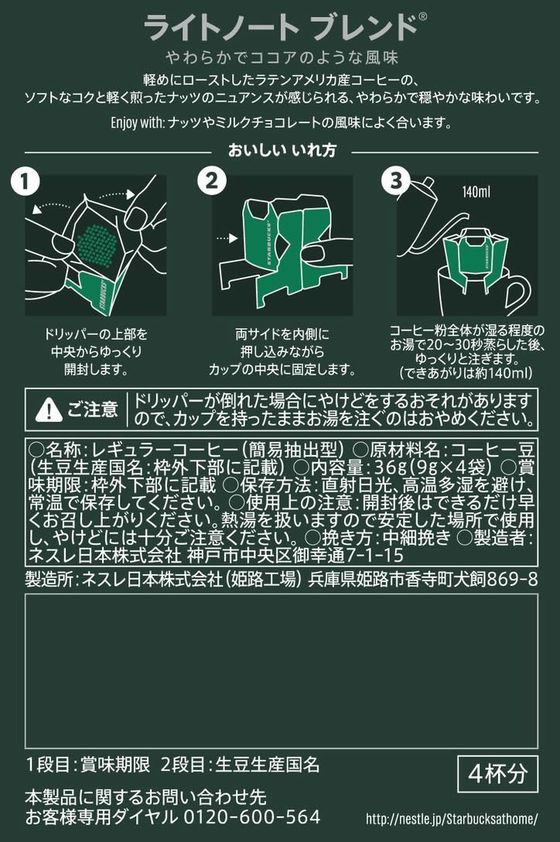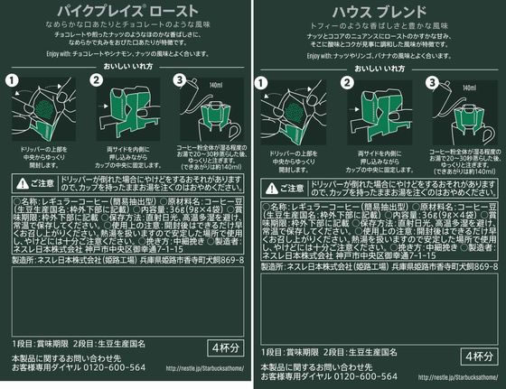 ●内容量:スターバックスオリガミパーソナルドリップコーヒー(ハウスブレンド9g×4袋2箱・パイクプレイスロースト・ライトノートブレンド・カフェベロナ各9g×4袋1箱)
