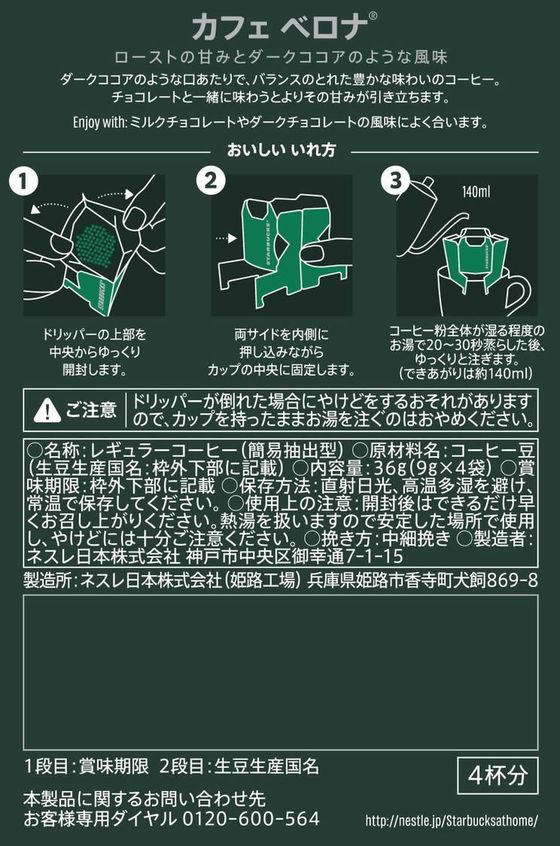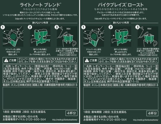 ●内容量:スターバックスオリガミパーソナルドリップコーヒー(ハウスブレンド・カフェベロナ各9g×4袋2箱・パイクプレイスロースト・ライトノートブレンド各9g×4袋1箱)