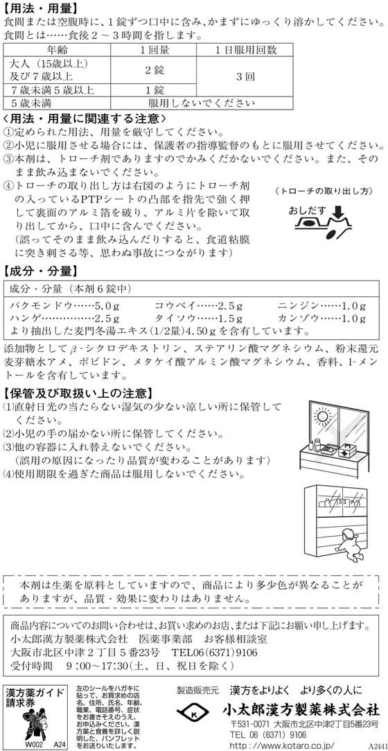 本剤は、漢方の古典「金匱要略」(後漢時代)収載の処方にもとづいてつくられたエキスをトローチ剤としたものです。