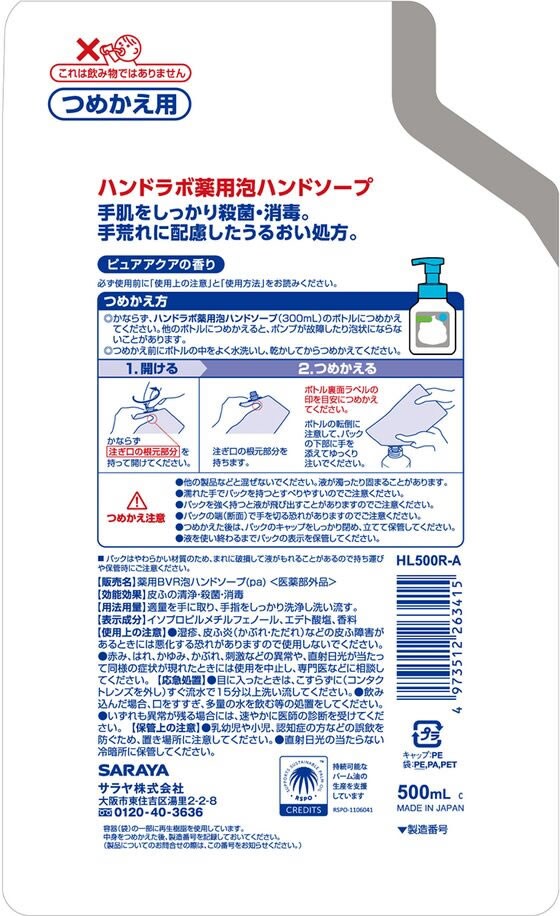 【お取り寄せ】送料無料 サラヤ ハンドラボ 薬用泡ハンドソープ 詰替用 500mL 18個 泡ハンドソープ ハンドケア スキンケア