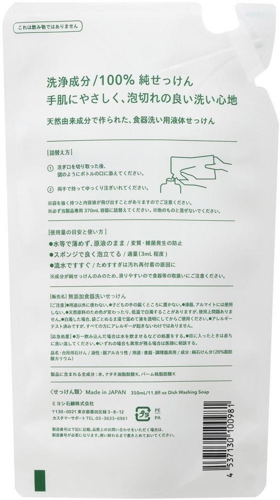 ミヨシ石鹸 無添加食器洗い石鹸 詰替用スタンディング 350mL 食器洗用洗剤 キッチン 厨房用洗剤 洗剤 清掃