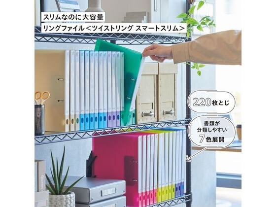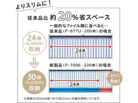 背幅がスリムなのに収容量が20%アップ!ファイル棚にもコンパクトに収納できる。