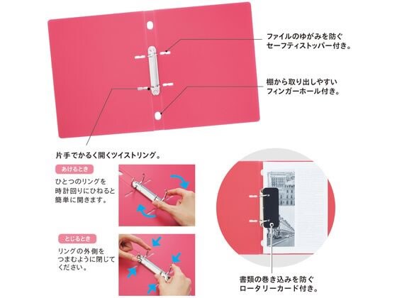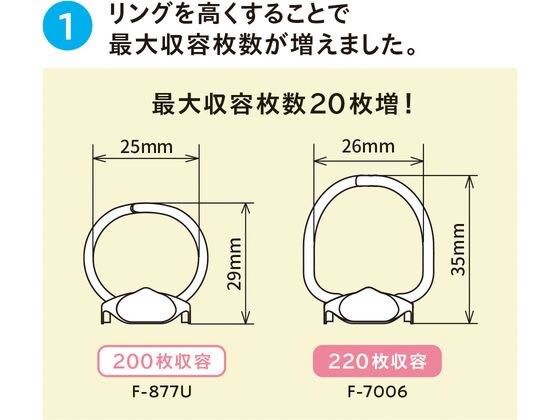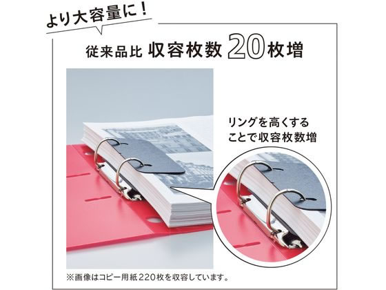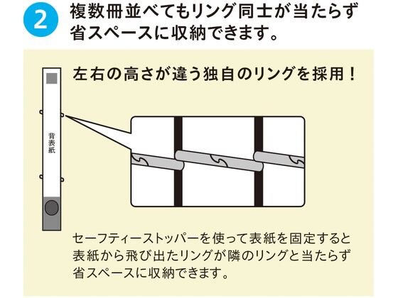 新しい形状のリング金具の採用で、従来のリングファイルよりファイル棚への収容量がアップ。表紙のセーフティストッパーから出ているリングは左右の高さが異なる為、ファイルを並べた時に隣のリングに当たらず、省スペースに収納できます。内径26mmのリングを高くすることで、収容量が20%アップ。