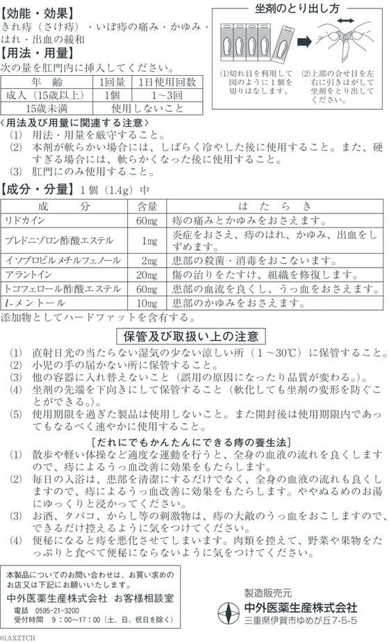 中外医薬生産 ちゅうがいいやくせいさん チュウガイイヤクセイサン ザッスルAX坐剤 ざっするAXざざい 痔の薬 痔疾用薬 坐剤 座剤 坐薬 座薬 1箱 10個 指定二類医薬品 きれ痔 さけ痔 いぼ痔 痛み かゆみ はれ 出血 切痔 裂け痔 イボ痔 痒み 腫れ