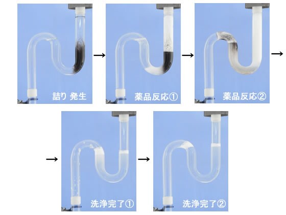 台所、洗面所、浴室などの排水管内に付着した油脂類、ぬめり、毛髪その他有機質汚れの除去。詰まり、悪臭の予防。除菌。発熱による軟化作用と発泡による剥離作用が効果的に作用。排水トラブルの原因となる油脂タンパク汚れを強力に溶解し、粘性汚れを溶解し付着している堆積物も同時に除去。