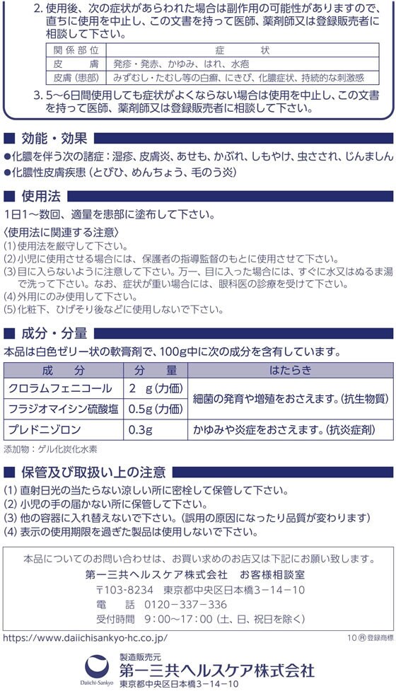 化膿を伴う次の諸症:湿疹、皮膚炎、あせも、かぶれ、しもやけ、虫さされ、じんましん化膿性皮膚疾患(とびひ、めんちょう、毛のう炎)