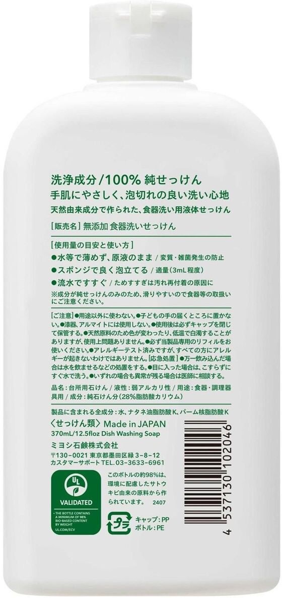 ミヨシ石鹸 無添加 食器洗いせっけん ボトル 370mL 食器洗用洗剤 キッチン 厨房用洗剤 洗剤 清掃