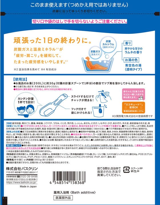 ●カルシウム炭酸湯/疲労・肩こりに/ラムネの香り/青空色の湯(透明タイプ)