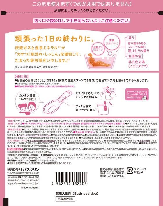 ●頑張った1日の終わりに。温泉ミネラル・炭酸ガス(温泉ガス)を凝縮したツブが発泡、成分がすばやくお湯に溶け込み、温浴効果で、たまった疲労感をいやしラクに。