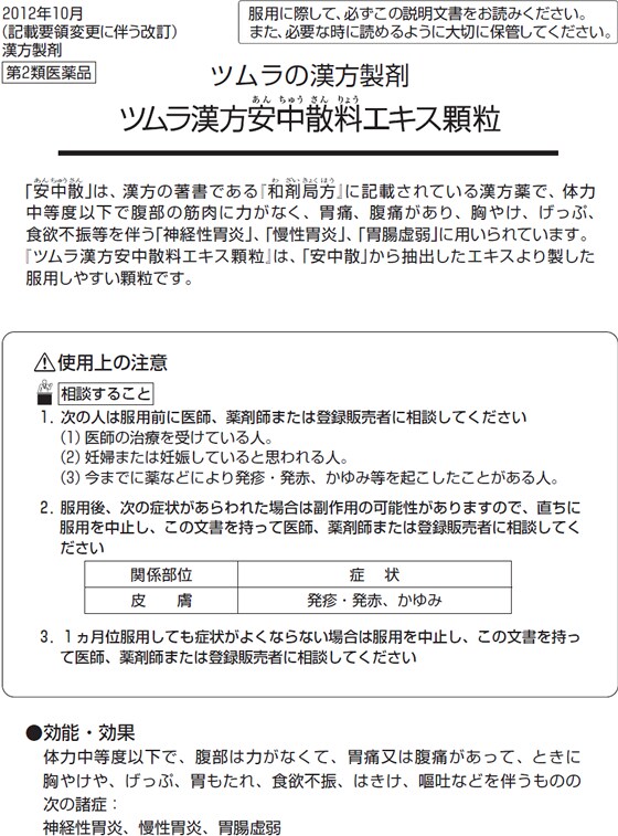 「安中散」は、漢方の著書である『和剤局方』に記載されている漢方薬で、体力中等度以下で腹部の筋肉に力がなく、胃痛、腹痛があり、胸やけ、げっぷ、食欲不振等を伴う「神経性胃炎」、「慢性胃炎」、「胃腸虚弱」に用いられています。