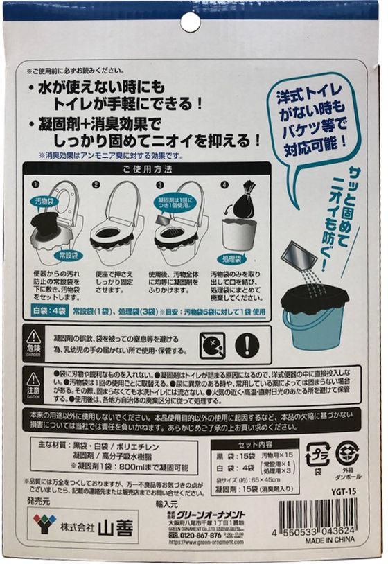 ●セット内容 : 凝固剤15個、汚物袋15枚、汚物処理袋3枚、トイレ常設用袋1枚