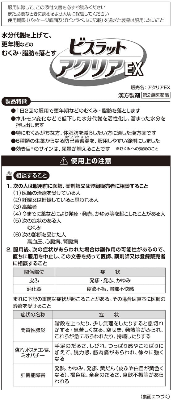 小林製薬 小林 こばやし コバヤシ ビスラットアクリアEX びすらっとあくりあEX ビスラット 防已黄耆湯 ぼういおうぎとう ボウイオウギトウ 漢方薬 漢方製剤 錠剤 1本 280錠 第二類医薬品 体力中等度以下 疲れやすい 汗をかきやすい 肥満症 筋肉にしまりのない 水ぶとり むくみ 肥満 関節の腫れ 痛み 多汗症 水太り ホルモン変化 ホルモンバランス 水分代謝 更年期 生活習慣病