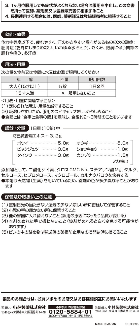 体力中等度以下で、疲れやすく、汗のかきやすい傾向があるものの次の諸症:肥満症(筋肉にしまりのない、いわゆる水ぶとり)、むくみ、肥満に伴う関節の腫れや痛み、多汗症