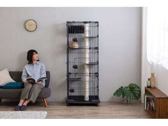 すっきり置けるスリムタイプです。屋根から床まで、支柱がつめとぎポールになっており、どの場所でも爪とぎができます。しっかり固定できるので安心です。4枚の棚板は段差がゆるやかで、上り下りがしやすくなっています。(子猫、シニア猫にも使いやすい設計です。)ハンモックが付いています。スムーズに開閉できるスライド扉です。移動に便利なキャスター付きです。お客様組み立てとなります。