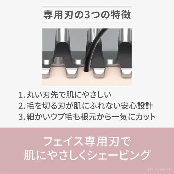 ・丸い刃先で肌にやさしい、約0.12mmのうす刃。水なしですっきり剃れる。・肌の凸凹に合わせて動く、密着スイングヘッド。・マユのお手入れができる。マユカバーとマユコーム付き。