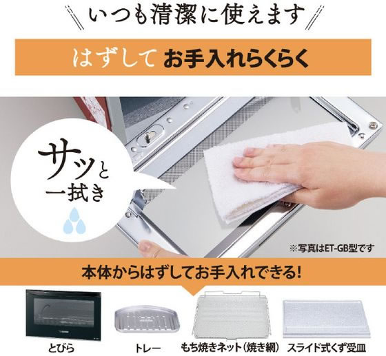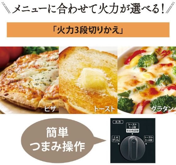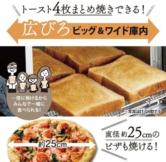 「トースト4枚が同時に焼ける」「25cmのピザが丸ごと焼ける」「ビッグ&ワイド庫内」。