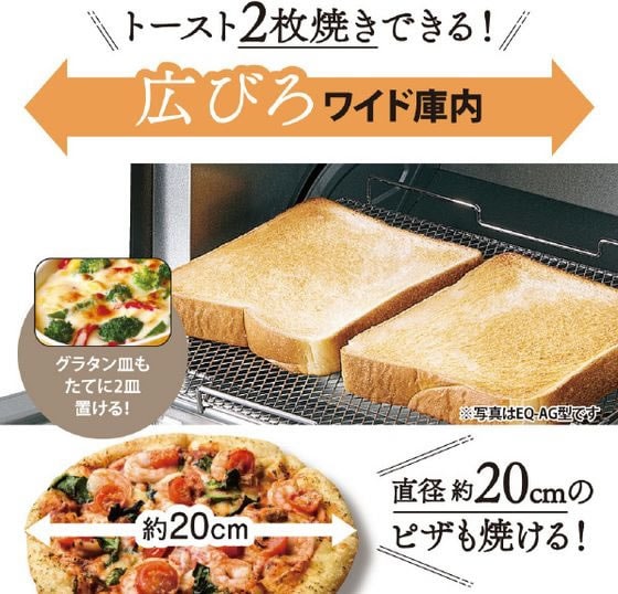 山形パンが2枚焼け、グラタン皿もたてに2枚置ける「庫内奥行22cm」。