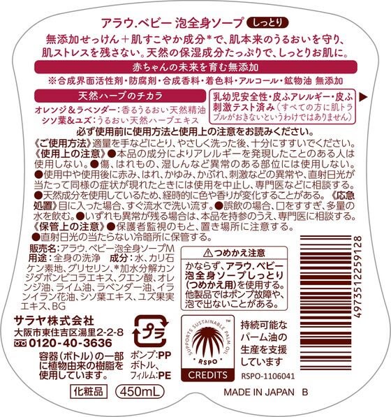 【お取り寄せ】 サラヤ アラウ.ベビー 泡全身ソープしっとり 本体 450mL スキンケア ヘルスケア ベビーケア