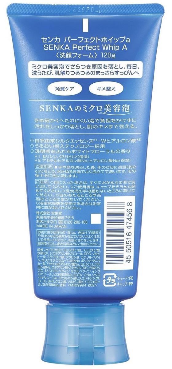 ●成分:水、グリセリン、ミリスチン酸、パルミチン酸、水酸化K、ジステアリン酸グリコール、DPG、ソルビトール、ステアリン酸、ラウリン酸、ラウリルベタイン、ポリクオタニウム-7、塩化Na、ポリクオタニウム-6、アセチルヒアルロン酸Na、セリシン、ヒアルロン酸Na、ステアリン酸グリセリル(SE)、合成ワックス、ミリスチルベタイン、セチルベタイン、イソプロパノール、ピロ亜硫酸Na、EDTA-2Na、シクロヘキサン-1、4-ジカルボン酸ビスエトキシジグリコール、BHT、クエン酸、ソルビン酸K、トコフェロール、安息香酸Na、香料
