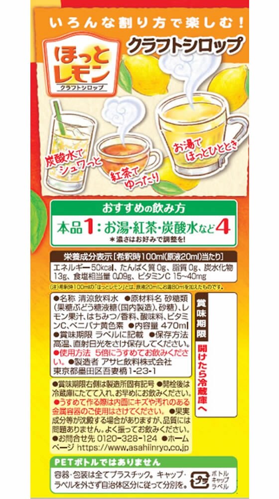 アサヒ飲料 クラフトシロップ ほっとレモン 470mL×12本