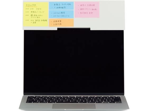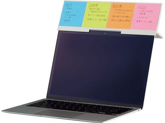 ノートPCの上部に設置して要点をチェック!Web面接で。Web会議で。TO DOリストに。カメラを隠さずふせんが貼れる。75×75mmふせん4枚貼り付け可能。ボード面の十字を目印に、きれいに並べられます。ノートPCの内蔵カメラを隠さない形状で、PC上部にふせんを貼るスペースを確保。