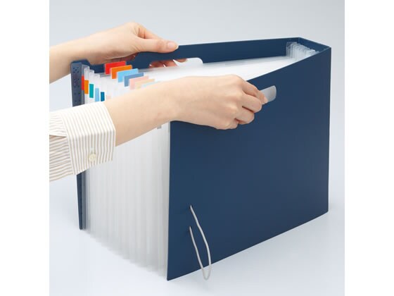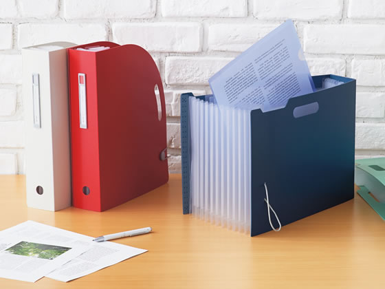 分類・検索性に優れたジャバラタイプのボックスファイル。卓上では大きく広げて使え、しまう時はスッキリ収納。