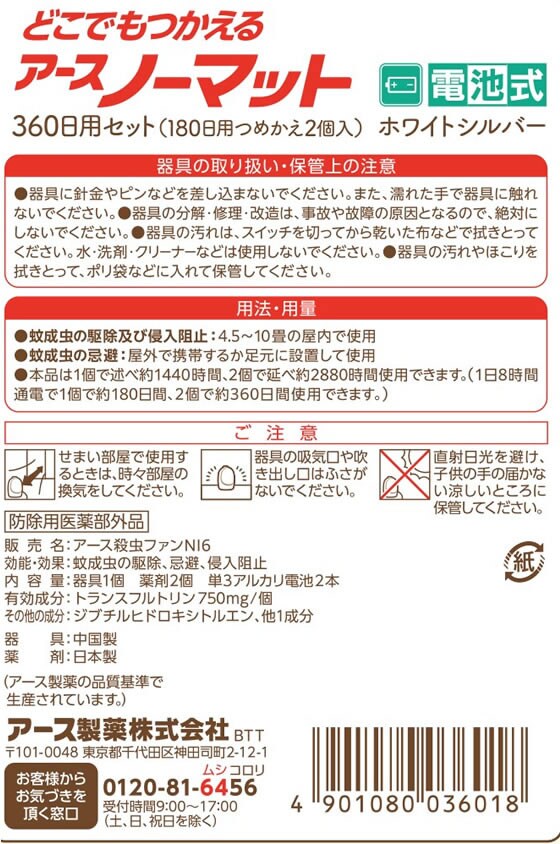 ●用法・用量:蚊成虫の駆除及び侵入阻止:4.5畳から10畳の屋内で使用/蚊成虫の忌避:屋外で携帯するか足元に設置して使用/本品は延べ約2880時間使用できます。(1日8時間通電で約360日間使用できます。)